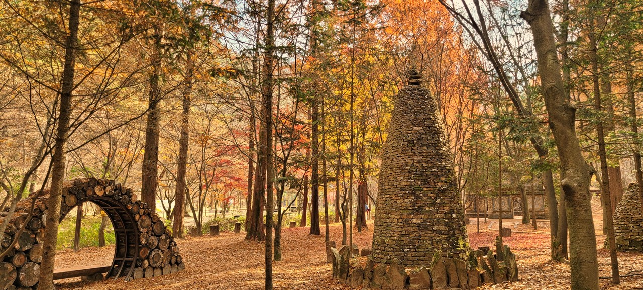 산림욕장 돌탑 옆 단풍길이 화려한 옷을 입었다. 끝자락 단풍은 한 폭 슬프도록 아름다운 풍경화다. 호젓하게 걷고있는 커플에게선 행복감이 묻어난다. 돌탑 근처에서 한 젊은 여성이 사진을 찍고 있다. 장태산휴양림이 임창봉 선생의 작품이라면, 상소동산림욕장 돌탑은 수년간 돌을 지고 나르며 쌓아 올린 ‘돌탑 할아버지’ 이덕상 선생 작품이다. 2003년 9월부터 2007년 5월까지 쌓은 이 돌탑들은 대가 없이 돌을 차로 실어와 지게에 지고 옮기면서 하나하나 쌓아 ‘한국의 앙코르와트’를 완성했다.