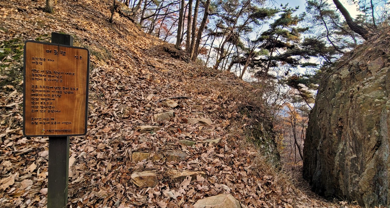 대전을 대표하는 시인 정훈(1911∼1992)은 삶의 애환을 고스란히 간직한 머들령 쪽바위에 기대 일제치하 민족의 한을 읊었다. 나무에 새겨진 머들령 시를 읽으며 물 한 모금, 다시 길을 나선다. 다시 오르막.