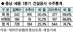 2013년 1분기 충남, 세종 소재 일반건설사들의 수주실적을 최종 집계한 결과 728개사 가운데 무실적 건설사가 544개사(74.7%)로 나타났다.