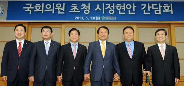 13일 대전시청에서 열린 ‘국회의원 초청 시정현안 간담회’에는 민주당 박병석 의원과 새누리당 박성효·이장우 의원, 민주당 이상민·박범계 의원과 염홍철 대전시장이 참석해 과학벨트 사업 정상 추진 방안을 놓고 논의를 진행했다. 이와 함께 충청권민관정협의체 구성과 도시철도 2호선 등 지역현안을 주제로 의견을 나눴다.