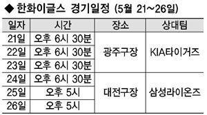 한화는 20일 현재 11승 24패 1무로 NC다이노스(10승 24패 2무)와 반게임차로 8위에 머물고 있다. 매 경기마다 꼴찌 추락의 위험을 안고 있는 한화는 21~23일 광주구장에서 KIA타이거즈와 원정 3연전, 24~26일 대전구장에서 삼성라이온즈와 홈 3연전을 치른다.