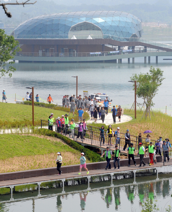 대전·세종·금강 상생축제가 22일 대전 유성구 반석동 자전거도로 만남의 광장과 세종호수공원에서 열려 걷기대회에 참가한 시민들이 호수공원 주위를 걷고 있다.