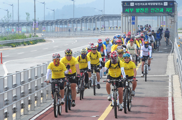 제2회 대전·세종·금강 상생축제 자전거대회에 참가자들이 자전거 페달을 밟으며 세종시 자전거로를 질주하고 있다.