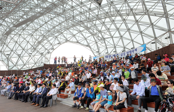 대전세종금강 상생축제 개막식장이 마련된 수상무대에서 많은 참가자들이 공연을 관람하며 행사를 즐기고 있다.