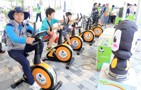 에너지관리공단 홍보체험관에서 참가자들이 자전거페달을 밟으며 에너지의 소중함을 일깨우고 있다.