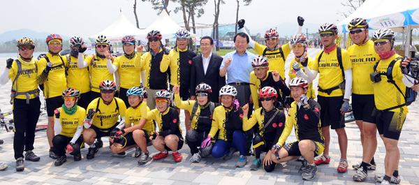 상생축제에 참가한 염홍철 대전시장, 유한식 세종시장이 자전거 동호회 회원들과 파이팅을 외치고 있다.