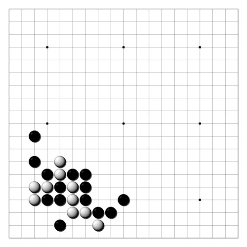 <문제도> 백이 둘 차례 요석인 흑 석 점을 잡으면 백 전체가 연결됩니다. 흑 석 점을 잡는 수는?