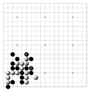 <2도 실패> 백①, 흑②는 필연적인 활용입니다. 그러나 이 다음 백은 어떻게 두더라도 공배가 메워져서 잡히고 맙니다.