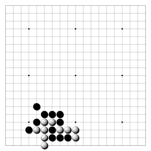 <문제도> 흑이 둘 차례 밖에 약점은 있습니다만, 무턱대고 백 여섯 점을 잡으로 갑니다. 그런수가 있긴 있습니다만….