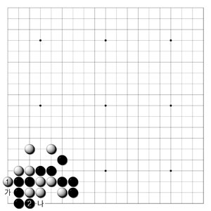 <2도 실패> 백①로 공격해 오면 흑②로 공배를 메워서 그만입니다. 백가에는 흑나의 단수에 걸려 아무래도 백의 실패입니다.