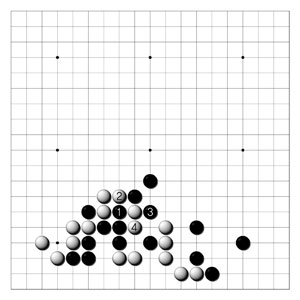 <2도 실패> 흑①로 나오더라도 백②로 끊어 버립니다. 흑③이면 백④, 흑이 ④라면 백은 ③으로 응수합니다. 백 한 점은 도저히 잡을 수가 없습니다.