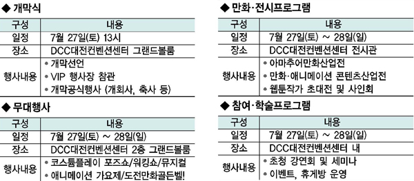 당일 축제 현장에서는 ▲20회 디쿠 특별전시회 ▲디쿠동인만화산업전 ▲금강일보 만평전시회 ▲만화 콘텐츠 상품 전시회 등 전시행사가 열린다. 또 ▲웹툰작가 초대전 ▲한국독립애니메이션 상영섹션 ▲인기 웹툰작가 사인회 등 문화행사가 마련됐으며 직접 만화 주인공의 의상을 입고 뮤지컬 및 연극에 참여하고, 문제를 풀며 만화에 관심을 가질 수 있는 만화 골든벨, 애니메이션 가요제 등 다양한 체험행사들이 펼쳐진다.