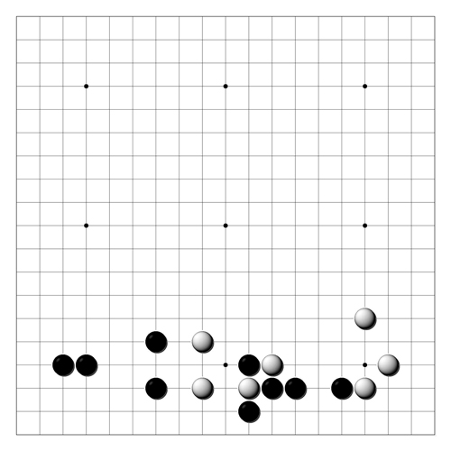 <테스트 10> 백이 둘 차례 좌하와 우변이 다 흑의 강한 모양입니다. 섣불리 저항했다가 공격 목표가 되어서는 안 됩니다.