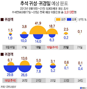 국토부는 추석 연휴동안 귀성교통량이 18일(수)에 집중(55.9%)되며, 귀경 때에는 추석 당일인 19일(목)에 36.5%, 20일 40.2%가 몰릴 것으로 내다봤다.