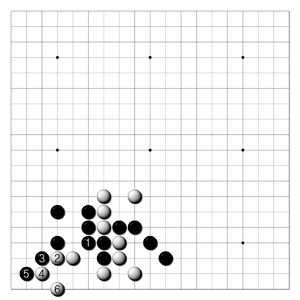<1도> 흑은 ①로 잇는 정도밖에 없습니다. 백은 ②, ④로 하변에 집을 만들고 ⑥까지로 간단히 살아 버립니다.