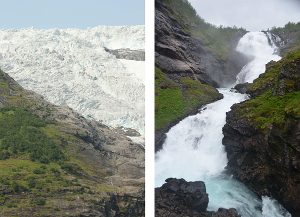 (오른쪽) 선물같은 풍경 낙차 93m의 효스 폭포(Kjosfossen). 플롬과 뮈르달을 운행하던 산악열차가 5분 정도 정차하여 폭포를 감상할 수 있게 해준다.