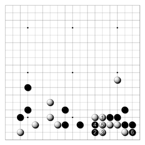 <1도> 보통은 백①의 응수로 무방한 것입니다만, 이 경우는 안 됩니다. 흑②, ④의 들여다봄이 하변의 수비와 백의 근거를 뺏는 일거 양득의 좋은 수입니다. 흑⑥까지 백을 공격하는 맛이 좋습니다.