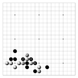 <1도> 백①로 좌우의 연결을 저지하면, 흑②로 젖혀 나오고 흑④, ⑥으로 백 한 점을 잡고서 중앙으로 머리를 내밉니다.