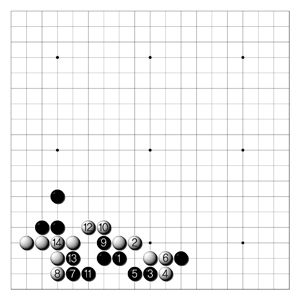 <2도> 흑①은 무거운 수입니다. 백② 다음 ③, ⑤로 붙여 늘어서, 이하 ⑬까지 하변에서 살 수는 있습니다만, 정해보다는 못 합니다.
