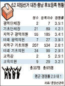 6·2지방선거의 대전·충남지역 경쟁률은 평균 2.9대 1로 집계됐다.대전·충남선거관리위원회가 지난 13∼14일 후보 등록을 접수한 결과, 8개 분야로 구분되는 이번 선거에선 337개 선출직을 놓고 총 975명이 출사표를 던져 2.89대 1의 경쟁률이 산출됐다.대전은 시장 1명, 구청장 5명, 시의원 22명(지역 19명·비례 3명), 구의원 63명(지역 55명·비례 8명)과 교육감 1명, 교육의원 4명 등 96명을 뽑는데 269명이 출마, 2.80대 1의 경쟁률을 나타냈다.충남은 도지사 1명, 시장·군수 16명, 도의원 40명(지역 36명·비례 4명), 시·군의원 178명(지역 152명·비례 26명)과 교육감 1명, 교육의원 5명 등 241명을 선출하는 가운데 706명이 후보 등록을 마쳐 2.93대 1을 기록, 대전보다 경쟁률이 높았다. 광역단체장의 경우 대전시장 선거는 한나라당 박성효, 민주당 김원웅, 자유선진당 염홍철, 진보신당 김윤기 후보가 출마해 4대 1, 충남지사 선거는 한나라당 박해춘, 민주당 안희정, 자유선진당 박상돈 후보가 나서 3대 1의 경쟁률을 보였다.기초단체장은 대전 5개 구청장 후보로 21명, 충남 16개 시장·군수 후보로 68명이 등록해 각각 4.2대 1, 4.25대 1의 경쟁률을 기록했다.광역의원은 22명을 뽑는 대전시의원 선거에 80명이 등록해 3.63대 1, 40명을 선출하는 충남도의원 선거에 132명이 등록해 3.3대 1의 경쟁률을 나타냈다.기초의원 경쟁률은 대전이 2.35대 1(63명 선출/148명 출마), 충남은 2.72대 1(178명 선출/485명 출마)로 조사됐다.교육감 선거는 대전이 한숭동, 오원균, 김신호 후보 간의 대결로 3대 1, 충남이 김종성, 강복환 후보의 맞대결로 2대 1의 경쟁률을 보였고, 교육의원 선거는 대전 3.25대 1(4명 선출/13명 출마), 충남 3.2대 1(5명 선출/16명 출마)로 파악됐다.한편 오는 20일부터 선거 하루 전인 내달 1일까지 공식 선거운동이 허용되며, 27∼28일 부재자 투표가 실시된다.