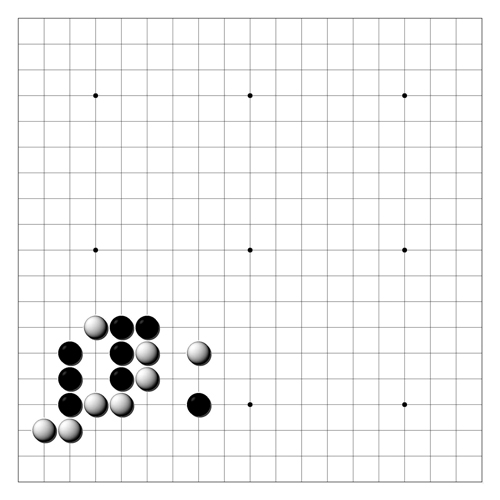 <문제도> 백의 모양이 깔끔하지만 한칸 뛴 점이 잘못된 수로 백의 잘못을 응징해야 한다. 백의 정수는 붙이며 탈출하는 수.
