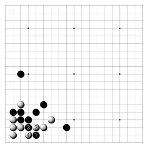 <3도> 흑1의 붙임도 맥점이나 백2, 4면 완생이라 후수로 봉쇄하는 정도, 그러나 흑에게 팻감이 없다면 이 그림이 무난하다.