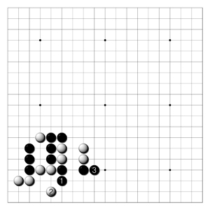 <3도> 흑1로 뻗을 때 백2로 귀를 살리면 흑은 힘차게 3으로는다. 중앙 백 넉점이 부담이 되는 형태로 흑은 집을 벌며 싸울 수가 있다.