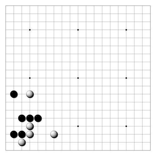 <3도> 흑1에는 백2로 붙이는 것도 하나의 수법이나 흑9까지 두터운 모양. 백2가 흑의 모양을 정비해준 이적수가 되었다.