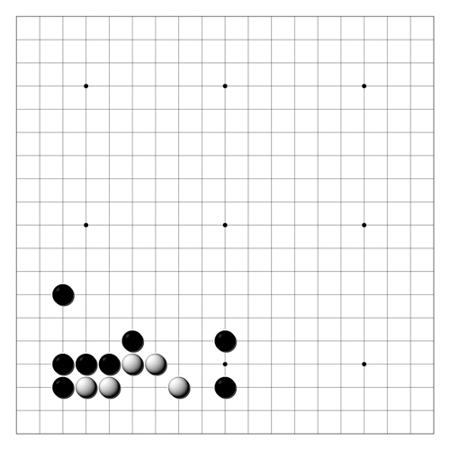 <문제도> 하변 백은 매우 단단한 모양이나 흑도 주위가 강해서 아직도 백을 노릴 수가 있다. 일단은 근거를 위협해야 공격이 가능하다.