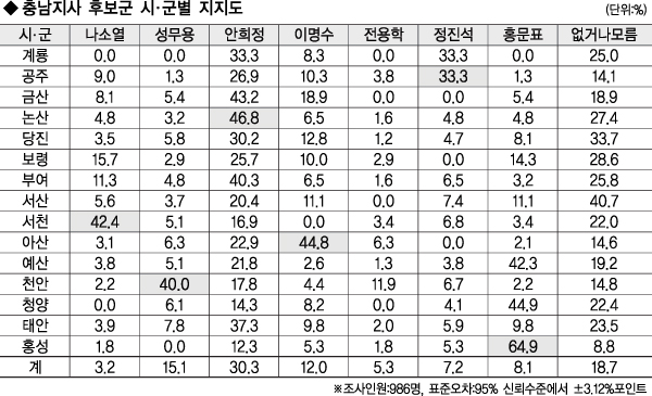 정진석 국회 사무총장(새)은 공주(33.3%), 나소열 서천군수(민)는 서천(42.4%)에서 안 지사(공주 26.9%, 서천 16.9%)에 우위를 나타내는 등 각 후보군들이 자신의 연고지에서 ‘이름값’을 했다.