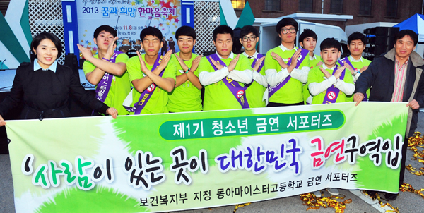 흡연 안돼! 동아마이스터고 금연 서포터즈가 담당지도교사 이은아 보건교사와 함께 ‘흡연은 안돼요’ 라는 퍼포먼스를 선보이며 금연 홍보를 펼치고 있다.