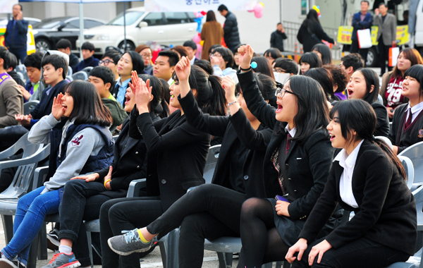 축하공연을 관람하는 수험생들이 환호와 박수를 치며 한마음축제를 즐기고 있다.