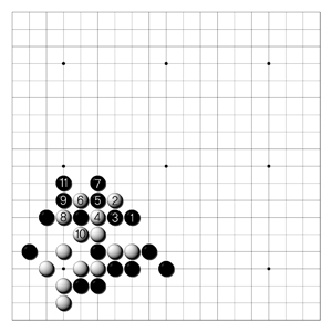 <문제도> 흑은 끊겨있어 둘중 한점은 죽어있다. 돌을 운신하는데 있어서 하나의 행마법과도 같은 수순으로 백을 옥집의 형태로 유도한다.