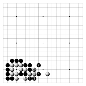 <3도> 흑1로 밀 때 백이 2로 늘면 흑3으로 막아서 수상전인데 흑이 한수 빠르다. 백으로선 어쩔 수 없지만 이렇게 두어야 한다.