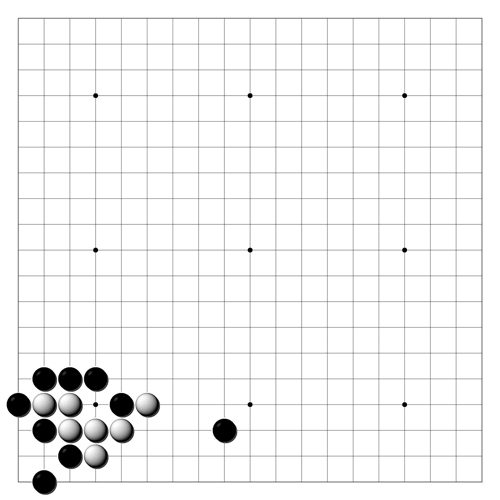 <문제도> 백 일단에 대한 공격은 어느정도 가능하겠지만 흑은 최대한 몰아붙여 우세를 확실히 하고자 한다.