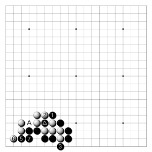 ◐ 12월 17일자 문제 해설 <1도> 흑1로 단수하여 백의 모양을 포도송이로 만드는 것이 강수로 흑5, 7로 젖혀이으면 A의 단점을 노릴 수가 있다.