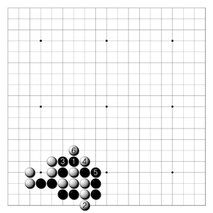 <2도> 흑1의 단수에는 백2로 내려 빠짐을 생각해야 한다. 흑3으로 이으면 백4, 6으로 축이 되는 것이다. 흑도 이렇게 당할 수는 없다.