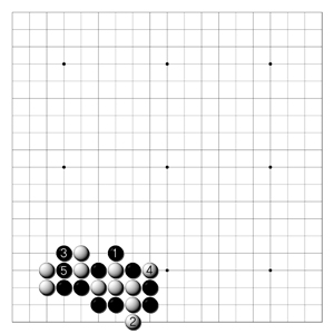 <3도> 백2의 강수에는 흑3이 교묘한 축머리로 백은 4로 두어야 한다. 흑5로 뚫으면 성공한 모습이다. 흑3이 축머리임을 확인해 본다.