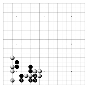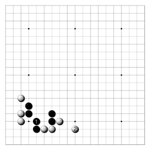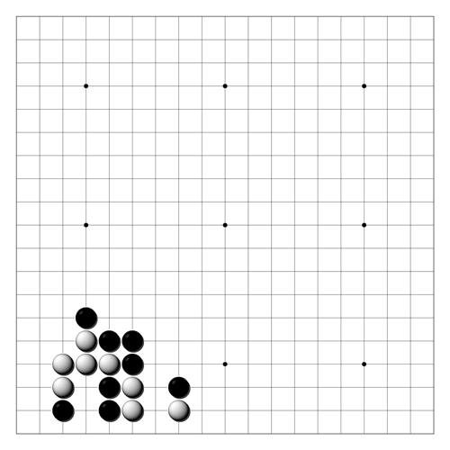 <문제도> 일단은 귀의 흑을 살려야 하는데 후수가 되어서는 곤란하다. 백의 약점을 노리며 궁도를 넓히는 첫수가 맥점이다.
