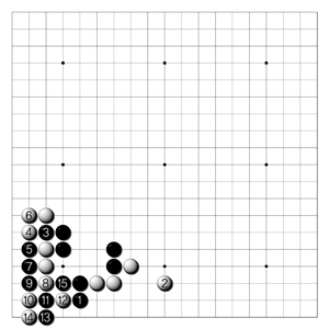 <3도> 백이 2로 지키면 흑3, 5의 수단이 성립한다. 이하 15까지는 상용의 수법으로 필연이고 백은 한수 부족으로 파멸이다.
