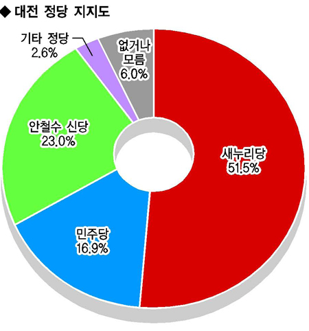 대전의 경우 새누리당 지지도가 51.5%로 수위에 올랐고, 아직 창당도 하지 않은 안철수 신당이 23.0%로 뒤를 이었다. 민주당은 16.9%로 안철수 신당에도 밀렸다.
