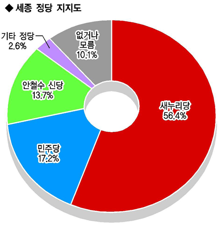 세종은 새누리당 56.4%, 민주당 17.2%, 안철수 신당 13.7%로 새누리당 지지도가 대전·충남을 웃돌았고, 민주당 지지율이 신당보다 우위를 보여 대전·충남과 다른 양상을 보였다.