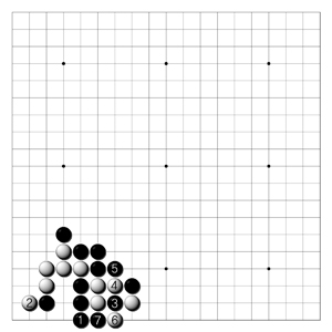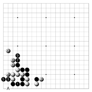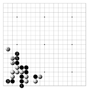 <3도> 흑1에 백이 강력하게 2로 막으면 흑3의 끼움이 맥점으로 5, 7이면 백은 몰아떨구기에 걸리게 되서 망한 결과.