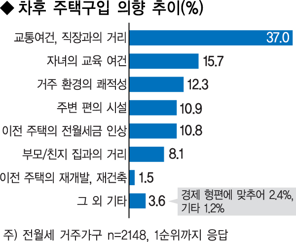 현재 전월세에 거주하고 있는 가구 2148가구 중 37%가 현 주택을 선택한 가장 큰 이유로 교통여건, 직장과의 거리를 꼽았으며, 향후 임차의향이 있는 가구 2061가구 중 30.4%도 교통여건, 직장과의 거리를 가장 중요한 고려사항으로 답변했다.