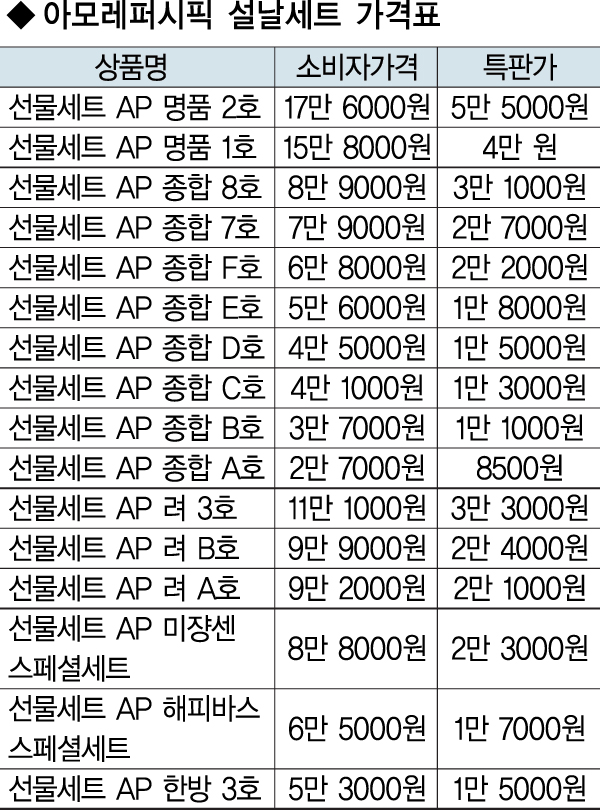 선물세트 AP 종합 A~F호, 종합 7·8호 등을 선보인 종합세트는 세트별로 다양하게 구성된 제품라인과 합리적인 가격으로 선물할 수 있다.