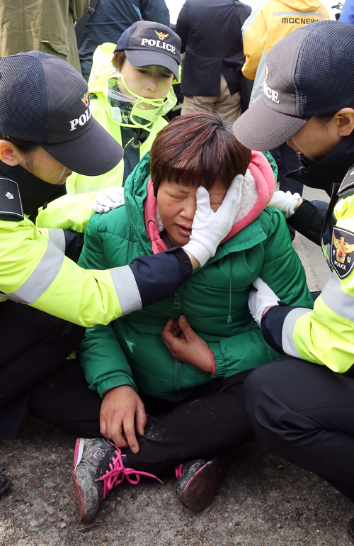 '세월호' 침몰 닷새째인 20일 오전 전남 진도대교 2km 앞 도로에서 여경들이 정부의 대처에 항의하며 청와대로 향하던 실종자 가족의 눈물을 닦아주고 있다. 연합뉴스