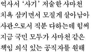 왜 이 땅에는 사마천 같은 공직자가 없는 것일까? 그런 공직자가 숨어있는 것인가? 그렇다면 찾아서 상을 줘야 하지 않는가? 상을 줄 사람을 좌천시키고, 벌을 줄 사람에게 승진과 상을 주는 일은 과연 없다고 장담할 수 있는가?
