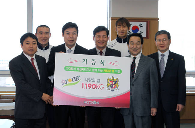 대전시티즌이 와이팜과 함께 사랑의 쌀 나눔행사를 가졌다. 대전시티즌은 지난 17일 대전시 정무부시장실을 방문, 사랑의 쌀 1190㎏을 대전 복지네트워크 복지만두레에 기탁했다. 대전시티즌은 올 시즌동안 어려운 이웃을 돕기 위해 올 초 연기군 영농조합 브랜드인 와이팜과 사랑의 쌀 협약을 맺고 승리 시 100㎏, 득점 시 10㎏의 쌀을 적립해왔다. 이번에 기탁한 쌀은 복지만두레를 통해 연말연시 어려운 시민들을 위해 사용될 예정이다.이날 기탁식에는 김윤식 대전시티즌 사장, 왕선재 감독, 최은성 선수, 박성호 선수, 홍근진 와이팜 쇼핑센터 사무국장 등이 참석했다.박현하 정무부시장은 "연고지역을 향한 프로구단의 따뜻한 사랑이 대전의 힘이 되고 모두가 화합하는데 큰 힘이 될 것"이라고 말했다.