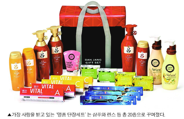 가장 사랑을 받고 있는 세트는 단연 ‘명품 단장세트’다. 끊어지고 갈라지는 손상된 모발을 매끄럽게 만들어주는 ‘려’ 함빛 극손상케어 샴푸와 린스, ‘려’ 흑운 뿌리볼륨 샴푸와 린스, 해피바스 바디워시, 두보레 모이스춰라이징 바, 치약·칫솔 세트를 포함해 총 20종으로 꾸며졌다.