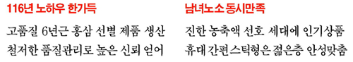 진한 홍삼 농축액을 선호하는 세대부터 간편한 스틱형 홍삼을 선호하는 젊은 세대까지 가족 구성원 모두 하나의 제품으로 함께 즐길 수 있는 특징을 가지고 있다. 또 지난해 추석 시즌에 출시해 프리미엄 선물 시장의 돌풍을 일으킨 ‘현-기품을 드리다’ 세트(45만 원)도 인기다.